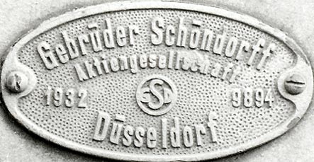Plaque de construction de la locomotive électrique Usinor-Thionville No 14 : Gebrüder Schöndorff Aktiengesellschaft 1932 GSD 9894 Düsseldorf) (Photo: 21.4.1981 Richard A. Bowen) |