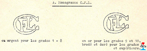 Monogramme C.F.L.. - en argent pour les grades 1 - 8; en or pour les grades 9 et 10 brodé et doré pour les grades 11 et supérieurs