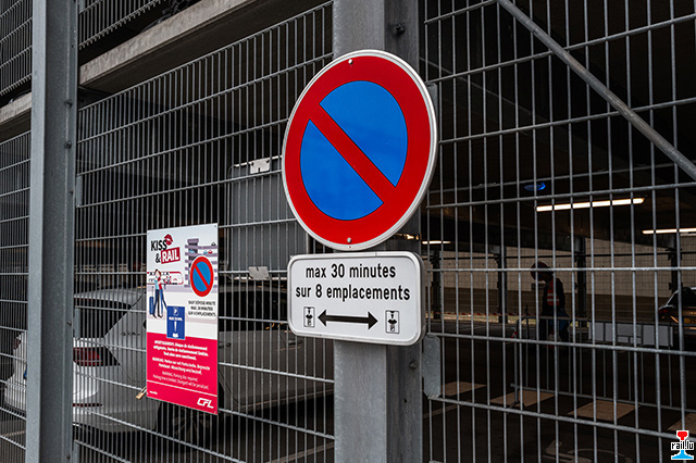 8 places (au lieu de 4 précédemment) sont désormais disponibles (durant 30 minutes maximum) au rez-de-chaussée extérieur du P+R de la Gare de Luxembourg. Reconnaissables au marquage au sol de couleur bleue, elles se situent à main droite après avoir passé la barrière d’entrée du P+R. (CFL: 14.10.2025)