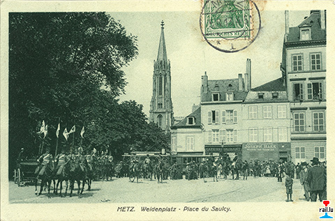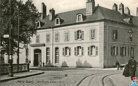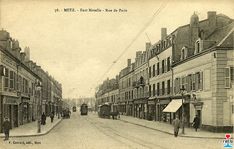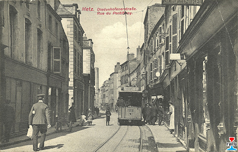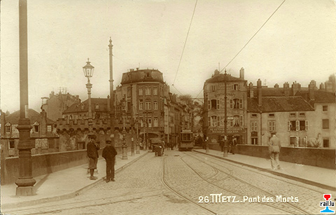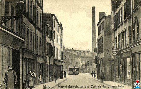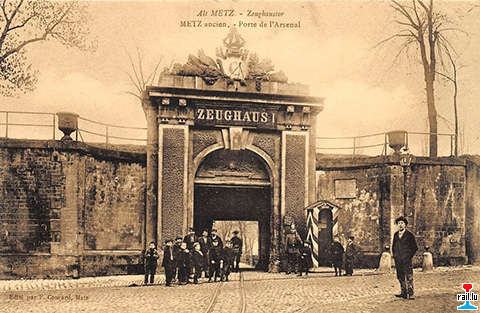 1. La voie ferrée militaire (600 mm) à Metz partait de la gare Devant-les-Ponts, passait par le Pont des Morts et le Moyen-Pont, bifurquait à droite dans la rue de la Garde, puis immédiatement à gauche vers le commandement régional et le Palais de justice.