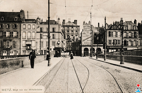 Metz - Moyen-Pont (Mittelbrücke) stadteinwärts - voie à deux écartements - voie à 3 rails - 3 Schienengleis: Tramways 1435 mm + 600 mm, um 1905 (AK Sammlung Richard Lutz)