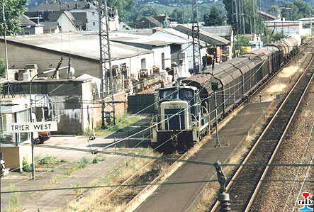 365 825 in Trier-West mit Tabakwaggons von Reynolds Tobacco und Kohlensäure-Kesselwagen