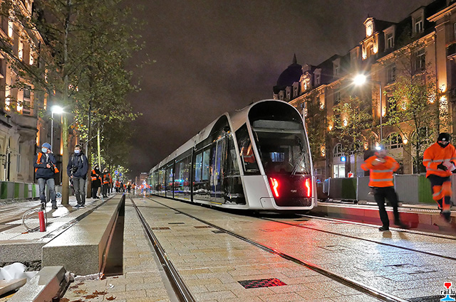 Marche à blanc : À partir du 30 novembre, le tram circule dans les conditions normales de son exploitation, c’est-à-dire à son horaire régulier, mais sans voyageurs sur le nouveau tracé vers la gare centrale, ici les rames 116 et 106. (Photo: 30.11.2020 jmo)