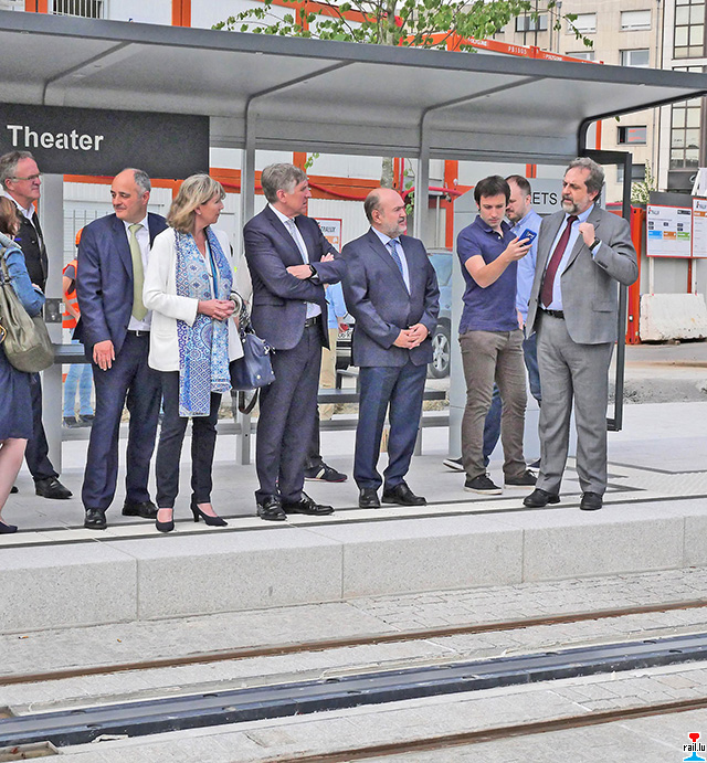 Am Montag, 4. Juni 2018 stellte Luxtram in Beisein von Transportminister François Bausch, Stadtbürgermeisterin Lydie Polfer, dem hauptstädtischen Transportschöffen Patrick Goldschmidt, Luxtram Generaldirektor André von der Marck und dem CAF-Verantwortlichen für Westeuropa Antonio Campos (Bild, 1. v. r.) der Presse das neue Tram Teilstück zwischen Rout Bréck/Pafendall und Stäreplaz vor, das am 27. Juli in Betrieb gehen wird. Bei dieser Gelegenheit wurde auch das oberleitungslose Stromversorgungssystem der Luxtram („CAF Greentech Freedrive“ oder „Acumulador de Carga Rápida“/ACR) erklärt: Die Trams sind mit Batterien und Superkondensatoren („Supercapacitors“) ausgestattet, welche an den Haltestellen über eine kurze Stromschiene im Boden geladen werden: Diesen Vorgang nennt man „Biberonnage“. Von „Biberon“ wie „Schnullerflasche“: Das Bild braucht wohl nicht extra erklärt zu werden. In der spanischen Stadt Saragossa, wo auch die Luxtrams von der Firma CAF gebaut werden, funktioniert ein solches System seit drei Jahren laut CAF-Angaben einwandfrei. In Luxemburg soll es laut Luxtram bislang auch keine Probleme gegeben haben.