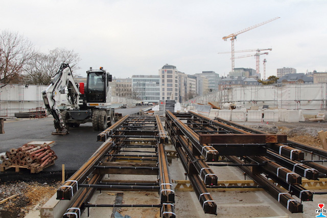Luxembourg; chantier tramway Pafendall - Rout Bréck - Etoile, futur pôle d'échange “Stäreplaz / Etoile", pose des voies (Photo: 28.02.2018 Nico Mercatoris)