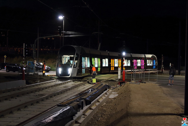 Essais de nuit Luxtram; la rame 101 quitte le dépôt et traverse le Rond-point Serra; un design moderne accompagné d'un jeu de lumières, le départ vers une nouvelle époque pour les transports en commun de notre pays! (Photo 31.07.2017 Mercatoris Nico)