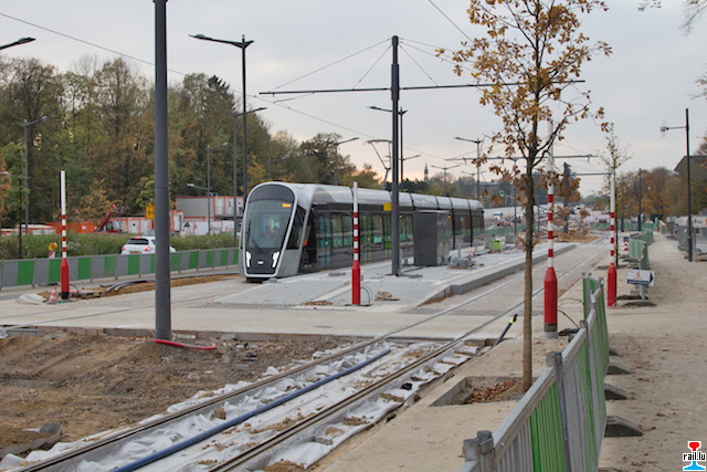 Marches à blanc Luxtram à partir du 02.11.2017; une rame encore sans numéro stationne à l'arrêt "Pafendall Roud Bréck" (Photo: 3.11.2017 Nico Mercatoris)