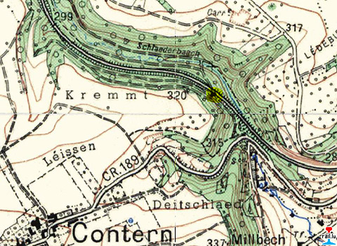 Hei ass eng Karte vun 1954. Die giel markéiert Platz (an der Mëtt, riets vun Kremmt 320), nordöstlëch vu Contern, misst d'Stellwierk Schlaederbaach weisen, oder?