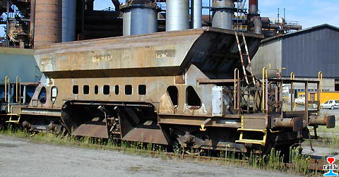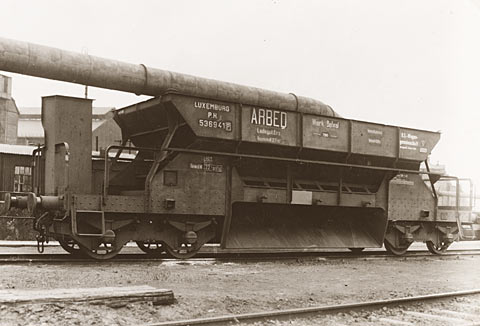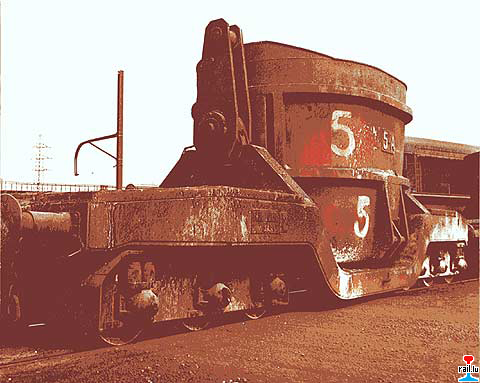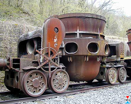 ![]() Schlackenwagen - Chariot avec poche à laitier construit par ARBED Eich pour Terres Rouges, Esch/Alzette (capacité: 9,5 m3; poids total: 36 t) (Photo: ARBED Dommeldange) |