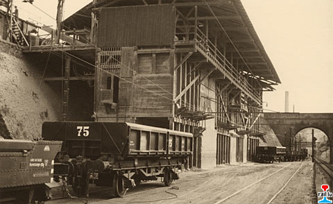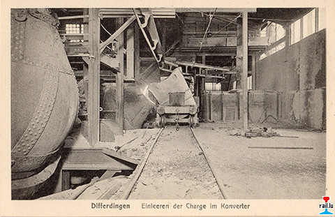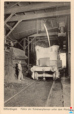 Hütte Differdingen - Füllen der Roheisenpfannen unter dem Mischer (Carte postale: Verlag Ch. Grieser, Hofphotograph, Luxemburg, 1916; collection: industrie.lu)