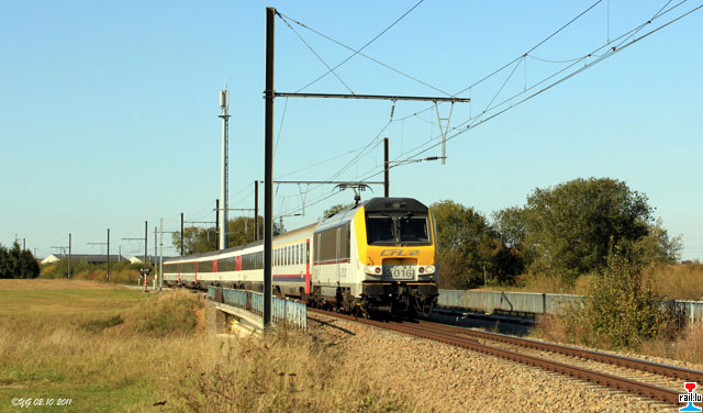 Détournement des trains internationaux, suite au chantier à Helfenterbruck: Train 97 "Iris" avec CFL 3016 après son entrée sur la   ligne 167. Notez les supports de caténaires très particuliers et muni d'isolateurs 25kV, alors que la ligne est alimentée en 3kV.   (Photo: 2.10.2011 Yves Gillander)