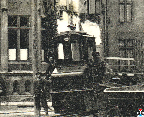 Architekt: Pierre Funck-Eydt). Auf dem Bild ist die AEG-Elektrolok (wahrscheinlich die N° 165; 1902; Ausstellung Osaka, Japan; 600 mm; 25 kW; 500 V) des