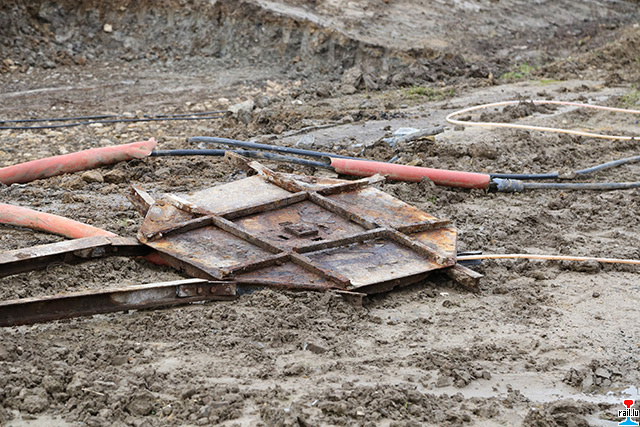 Rechter vun der Feldbunn um Site vun der fréierer Seeërie Clement zu Jonglënster - dat Gleis waat nach leit ass op der Héicht vun den Containerën; et schengt och nach drënner weiderzegoën...... (Photos: 21.11.2014 Serge Pletgen)