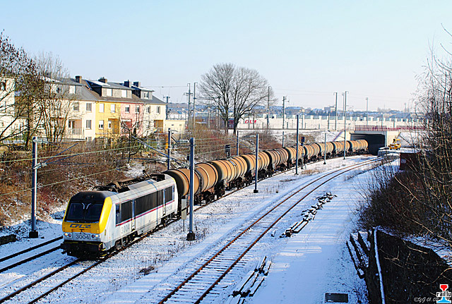 CFL 3004 avec train d'essence sur la courbe de raccordement entre le triage de Luxembourg et la ligne 70 vers Pétange (Photo: 1.2.2012 Yves Gillander)