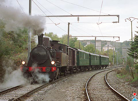 Sonderzug "Minettszuch Fond-de-Gras - Rümelingen-Langengrund" (Musée National des Mines à Rumelange) mit der AMTF-Dampflokomotive No 5 in der Verbindungskurve Scheuerbusch - Brucherberg (Photos: Mike Wohl 4.10.2003)