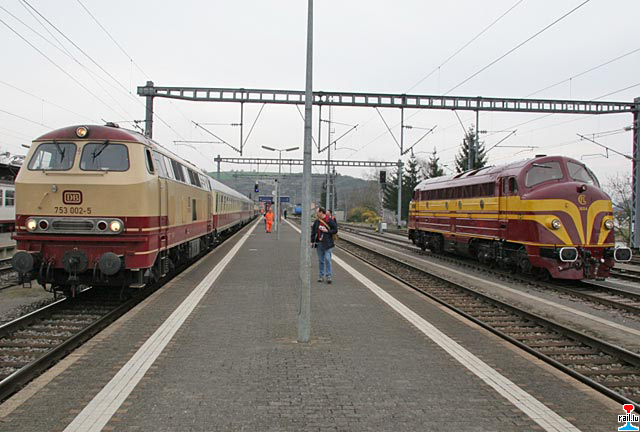 Diesellok 217 002 (753 002) mit Rheingold-Express und SSMN Lokomotive 1604 in Wassserbillig (Photo: 15.4.2006 Christian Schmitz)