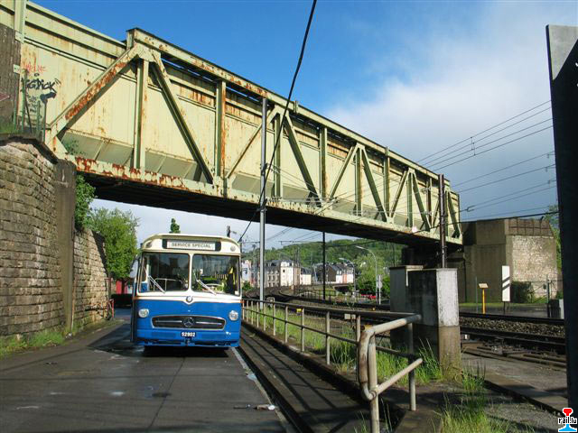 Le Bus 34 et le Train spécial "Guy Baumann Express" Fond-de-Gras - Audun-le-Tiche avec la locomotive CFL 851, à Esch/Alzette (Photos: 20.5.2006 Arsène Pennartz)