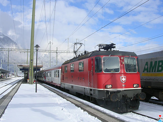CFL-Wantersportzuch mit SBB-Lokomotive Re 4/4 II 11125, CFL-Wegmann-Reisewagen 494 , Corail-Reisewagen in Sargans (Photo: 9.02.2008 Marc Thoma)