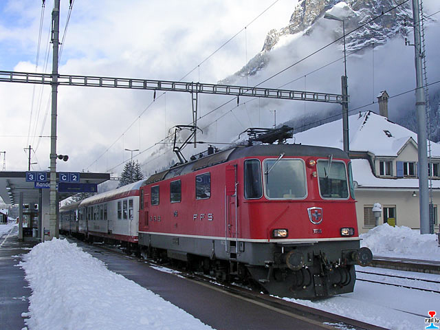 CFL-Wantersportzuch mit SBB-Lokomotive Re II 4/4 11196, CFL-Wegmann-Reisewagen und Corail-Reisewagen in Kandersteg (Photo: 2.02.2008 Michel Dondelinger)
