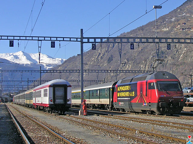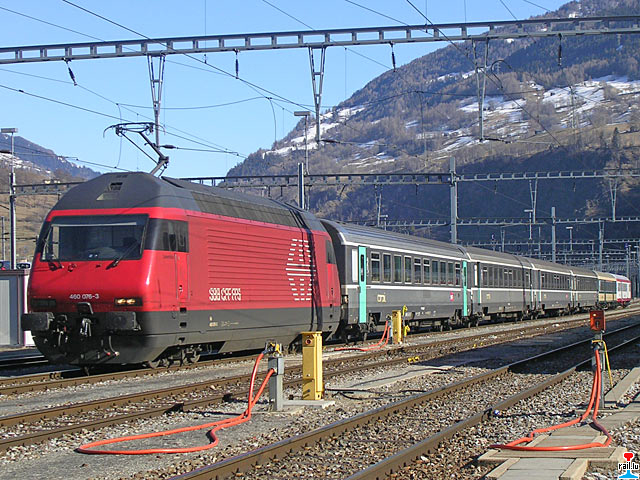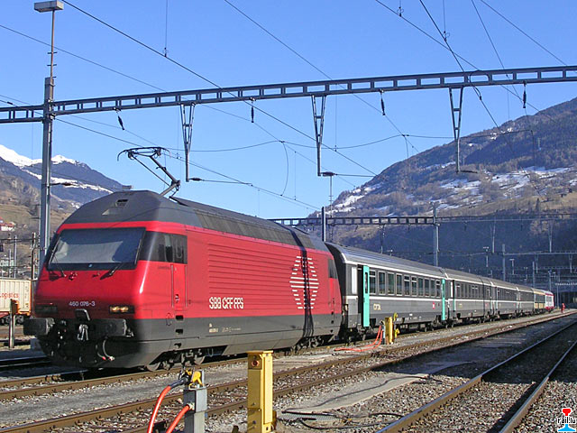 CFL-Wantersportzuch SBB-Lokomotive Re 460 076-3, CFL-Wegmann-Reisewagen und Corail-Reisewagen in Brig, Richtung