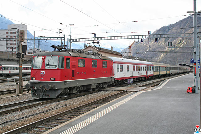 CFL-Wantersportzuch mit SBB-Lokomotive Re 4/4 II11196, CFL-Wegmann-Reisewagen, Corail-Reisewagen in Brig (Photo: 2.02.2008 Marc Schwartz)