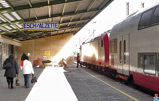 De Chantgen zu Esch brëngt allerlee ongewinntes: den RB6738 beim Départ ëm 12:48 zu Esch op Gleis 1, wou normalerweis d'Zich an der Direktioun Lëtzebuerg - Rodange fueren (Photo: 5.3.2008 Francis Wagner)