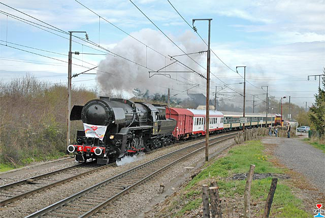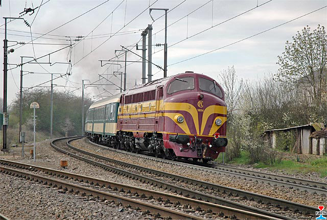 Télévie Stärenzuch mat der Dampflok 5519 an der Diesellok 1604 bei Naerzeng (Foto: 20.4.2008 Mike Wohl)