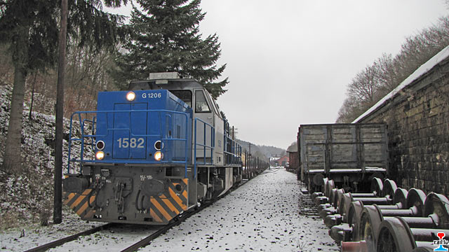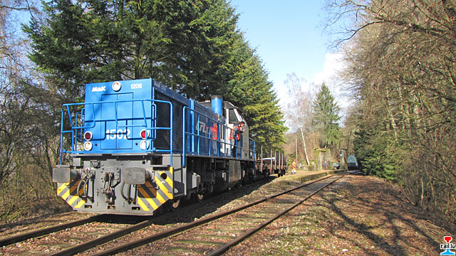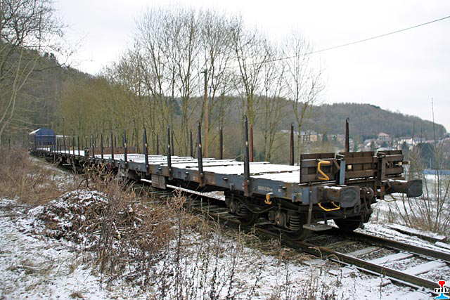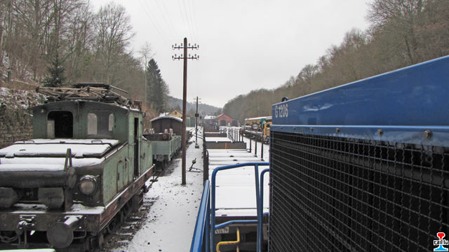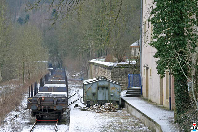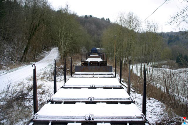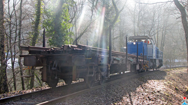 en Wagon mat Schinnen materopgehol an deen op Gleis 2 am Fuussbesch stoe