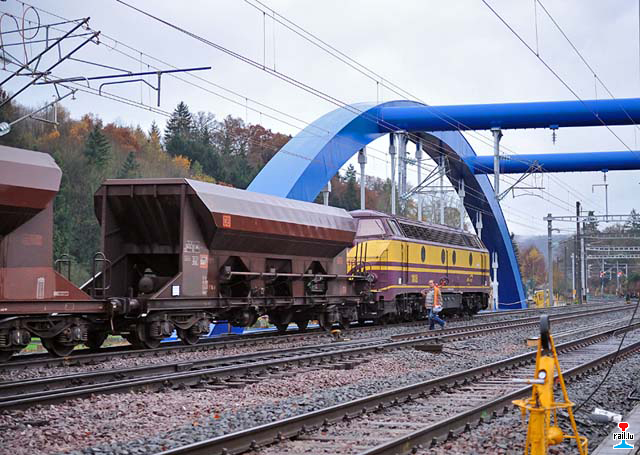 Le train de sable de la DB au crochet de la loco 1818 sur le nouveau pont Bow-String à Ettelbrück. Der DB-Sandtug am Haken der CFL-Cargo Lok 1818 auf der neuen Bogenbrücke in Ettelbrück. (Foto: 9.10.2010 Nico Berté)