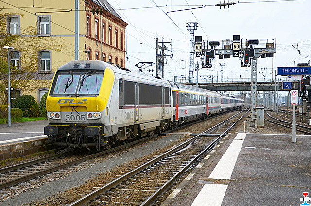 L'Iris entrant en gare de Thionville avec son "traditionnel" retard de 20 minutes! CFL 3005 en tête (Photo: 9.4.2012 Séb Steiner)