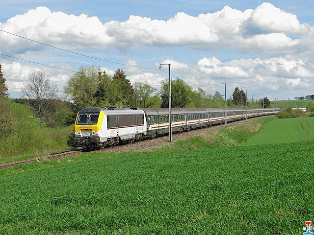 Train spécial 18543 Krakow - Luxembourg - Liège G. - Bruxelles-Midi. Le train a passé la faîte de Bellain et se trouve peu avant la frontière belge (pk 93.0). (Photo: 10.05.2012 Jo Mercatoris)