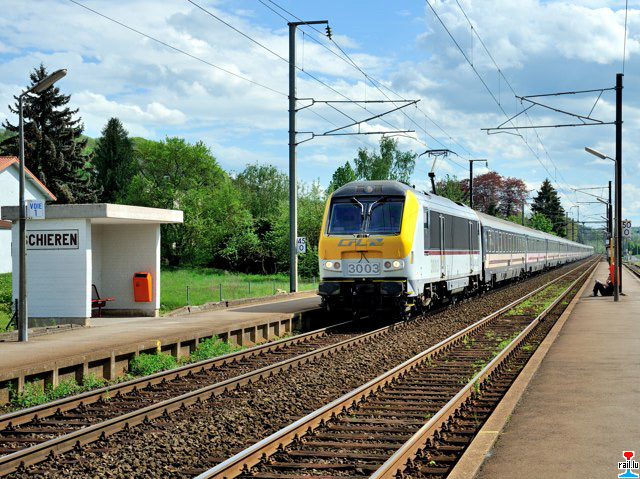 De Sonnerzuch vu Krakau mat der CFL 3003 zu Colmer-Bierg. De Sonnerzuch mat 1.000 belgschen Schüler vun Krakau aus Polen (wou se d'Konzentratiounslager vun Auschwitz besicht hunn) iwert Nordstreck - Grenz-Gare Gouvy - zeréckgefuer. Den Zuch bestong aus 16 Wén : 12 x SNCB Bc I6 + SNCB WR + 3 x SNCB B I6. (Photos: