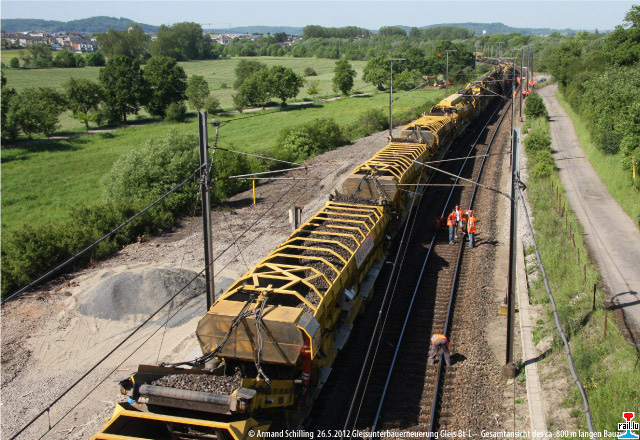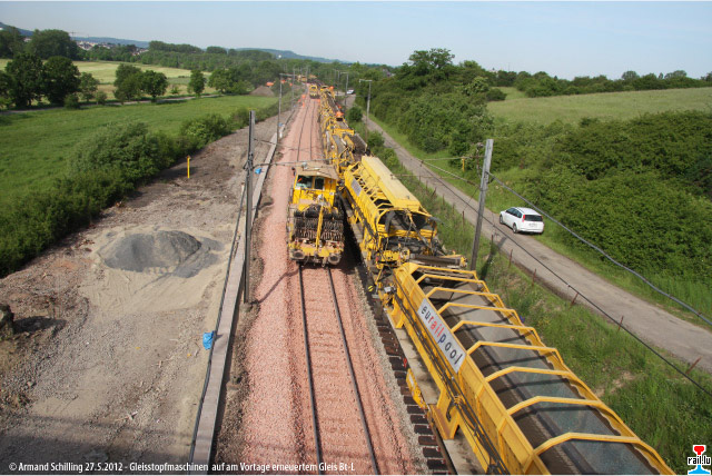 Stopfmaschinen in Aktion auf dem am Vortage fertiggestellten Gleis Bt-L (Photo: 27.5.2012 Armand Schilling)