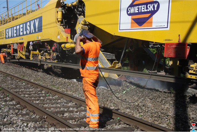 Ständiger Funkkontakt zwischen Mitarbeitern an und unter dem Bauzug (Photo: 26.5.2012 Armand Schilling)