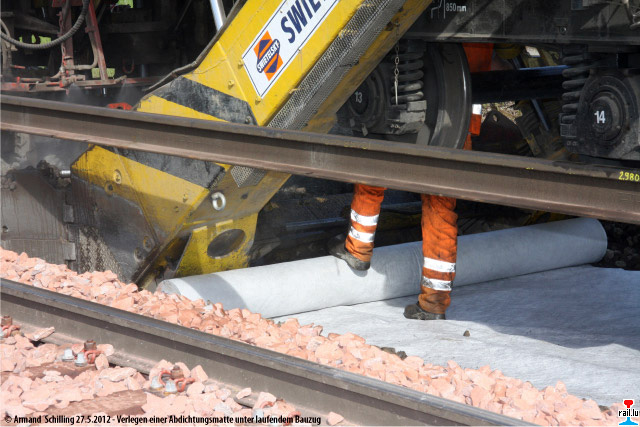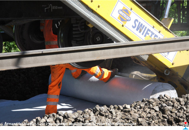 Verlegen einer Abdichtungsmatte unter laufendem Bauzug (Photo: 27.5.2012 Armand Schilling)
