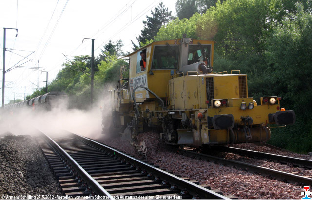 Verteilen von neuem Schottermaterial nach Austausch des alten Unterbaus (Photo: 27.5.2012 Armand Schilling)