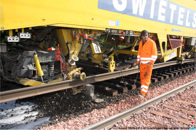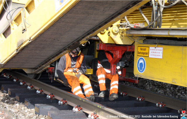 Kontrolle bei laufendem Bauzug nach Verlegen neuer Holzschwellen (Photo: 27.5.2012 Armand Schilling)