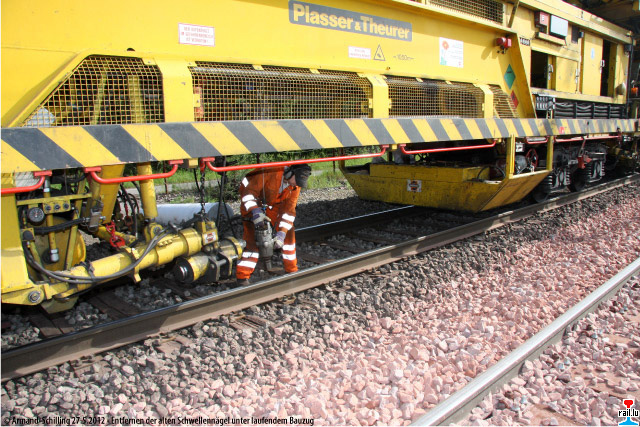 Entfernen der alten Schwellennägel unter laufendem Bauzug (Photo: 27.5.2012 Armand Schilling)