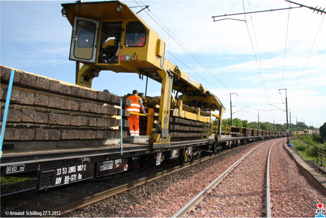 Schwellenstapler mit alten Holschwellen am Zugende (Photo: 27.5.2012 Armand Schilling)