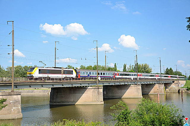 La CFL 3019 avec Vauban 91 sur le pont de la Moselle à Thionville. Coup de chance en première position dans le train une voiture en livrée Memling. (Photo: 28.5.2012 Séb Steiner)