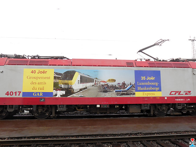 Den Zuch bestong aus der CFL 4017 (G.A.R. an Letzebuurg-Blankenberge Express Jubiläums-Lokomotiv) mat 3 grin'en Wegmänner an der Voiture Rendez-Vous.