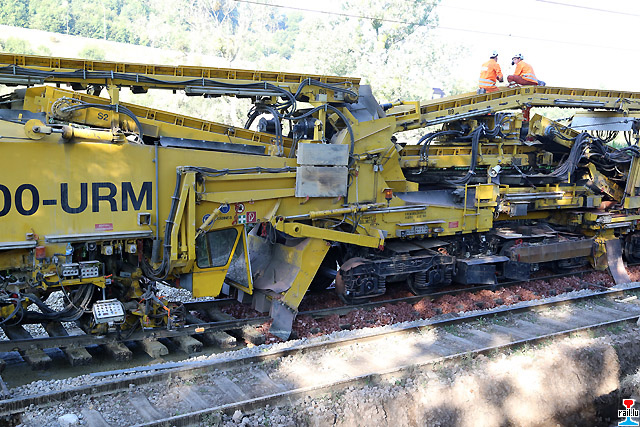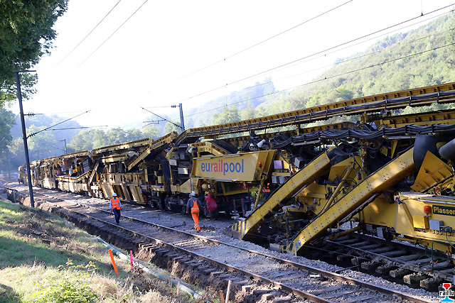Transfert du train de renouvellement de voies RU 800 S qui entrera prochainement en action sur la ligne du Nord. Le train est vu à Roodt / Syre au crochet de la CFL Cargo 1583 (Photo: 6.9.2013 Loïc Mottet)