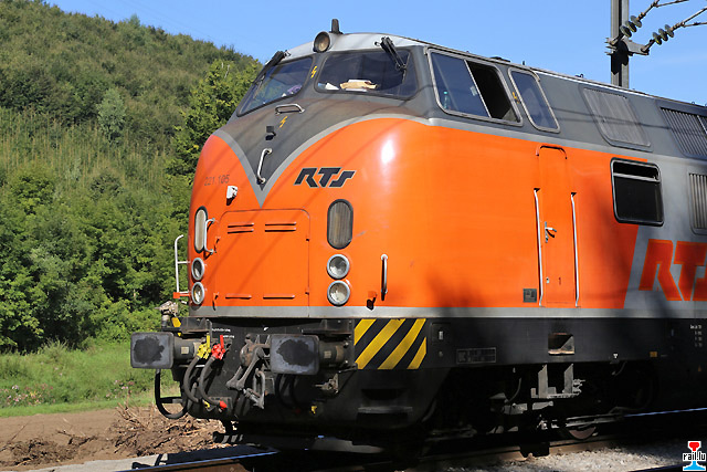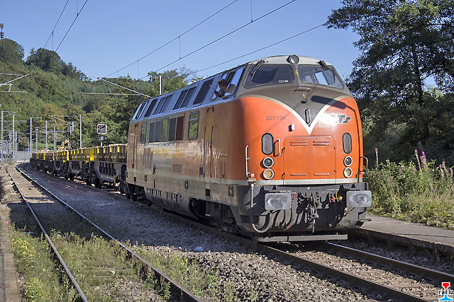 RTS 221.105 (RTS ass éng éstréisches Firma, duerfir den Punkt zweschen Baureih an Nummer) assmatt en puer Wén aal Schlacken oflueden gaangen (an Richtung Cruchten) (Photo: 5.9.2013 Guy Pettinger)