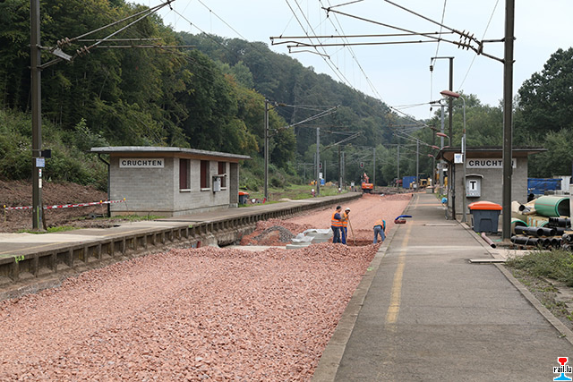 Chantier de renouvellement des voies à Cruchten. Dans le cadre de ces travaux, la ligne du nord est barrée entre Ettelbruck et Mersch du 23.08-15.09.14. Un service de substitution par bus est mis en place.