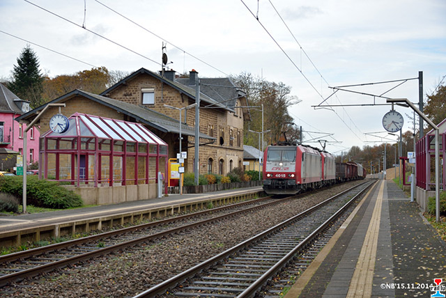 Der Güterzug 45664-4 erreicht den HP Sandweiler-Contern mit den CFL Loks 4015 und 4012 (Foto: 15.11.2014, Nico Berté)