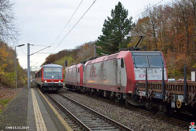 Kreuzung des Güterzugs 45664-4 mit dem RE 4914 Luxemburg-Trier Hbf in Sandweiler-Contern (Foto: 15.11.2014, Nico Berté)