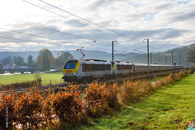 Parcours de formation automotrices SNCB 08 Desiro en vue du remplacement des rames tractées entre Liers et Luxembourg au changement d’horaire du 15.12.19. SNCB 08555 garée devant la remise à Troisvierges; à droite: départ vers Gouvy du train IC 117 Luxembourg-Liers (voitures SNCB I10 tractées par locomotive CFL 3019) (Photo: 14.11.2019 Mercatoris Nico)