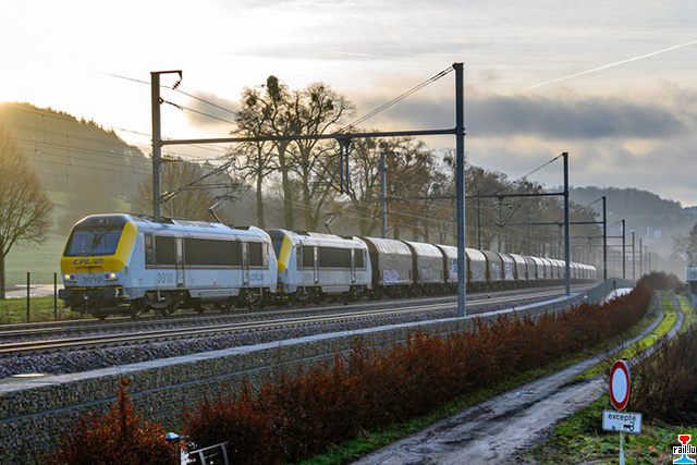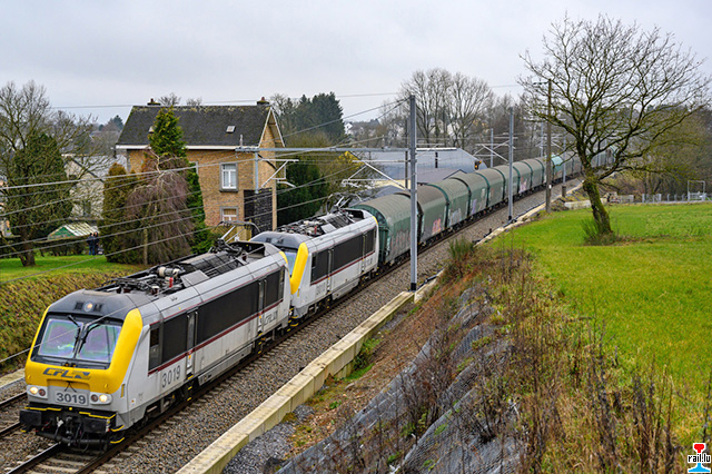 De beluedenen Zuch mat den CFL 3019 + 3010 op der L162 zu Rulles bei Marbehan. Well di 20 Ween mat Coils belueden ze schwéier sin, kann den Zuch net iwwert d’Nordstreck zréck kommen a fiert dowéinst iwwert Rochefort-Jemelle, Aarel, Athus zréck op Bétebuerg. (Photo: 4.1.2020 Nico Berté)