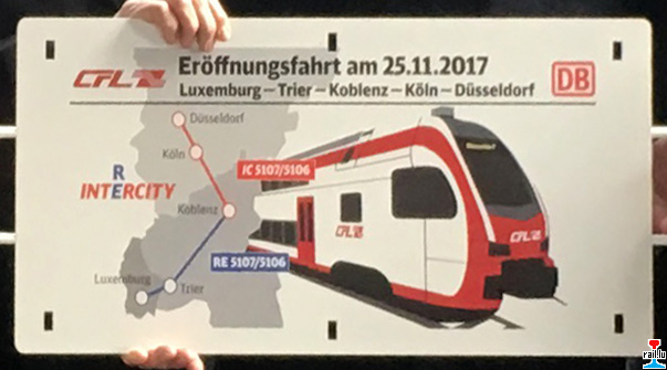 Aus Anlass des neuen Angebots fand heute eine Premierenfahrt statt mit anschließenden Festlichkeiten in Trier im Beisein von Birgit Bohle, Vorsitzende des Vorstands DB Fernverkehr und Marc Hoffmann, Direktor Personenverkehr der CFL, sowie des Ministers François Bausch, Ministerium für nachhaltige Entwicklung und Infrastruktur des Großherzogtums Luxemburg und des Staatssekretärs Andy Becht, Ministerium für Wirtschaft, Verkehr, Landwirtschaft und Weinbau des Landes Rheinland-Pfalz.