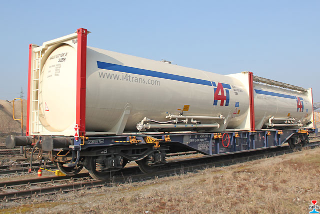 Un train complet de 1200 t se compose de 20 wagons Sgnss, à 2 conteneurs-citerne de ciment i4T inclinables intermodaux à 29 t